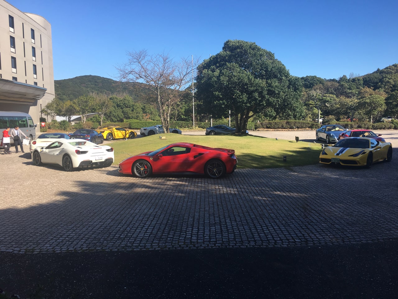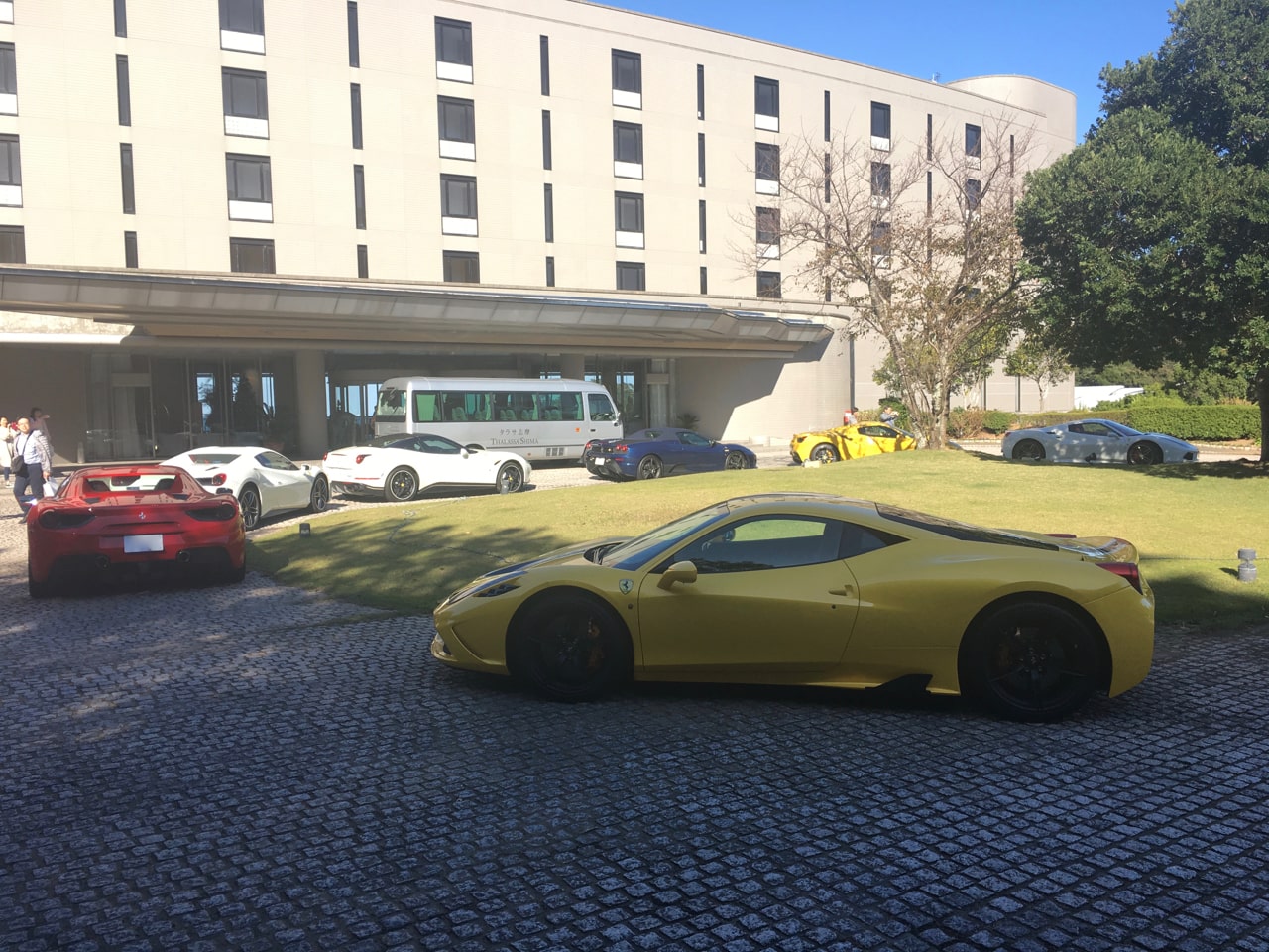 おかしいなと思いつつ食べ終えてホテルを出ようとすると、敷地内にはこれまた見覚えのあるスポーツカーがずらり