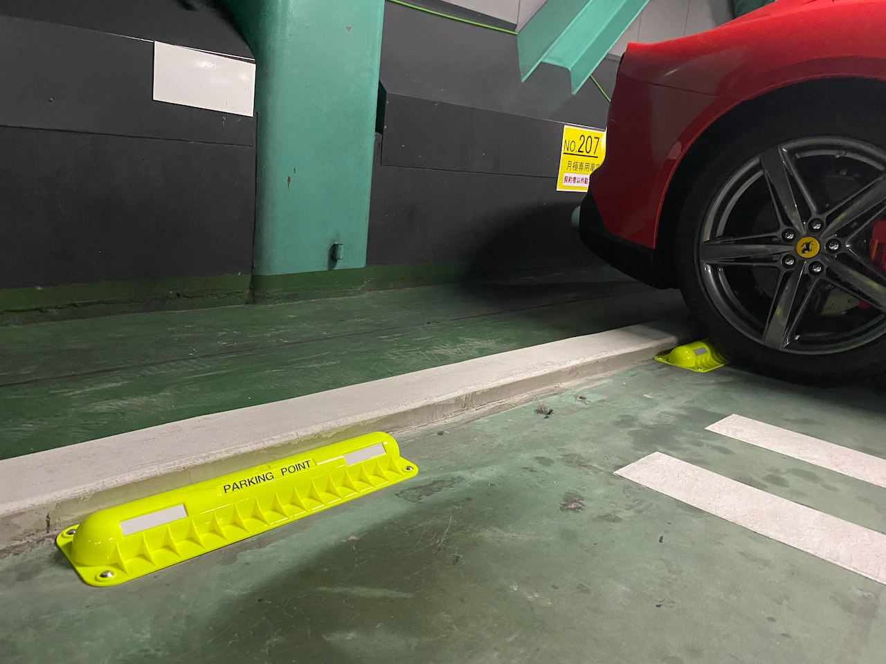 ○フェラーリ等のスーパーカーに対応した低い輪止めでディフューザーにも安心