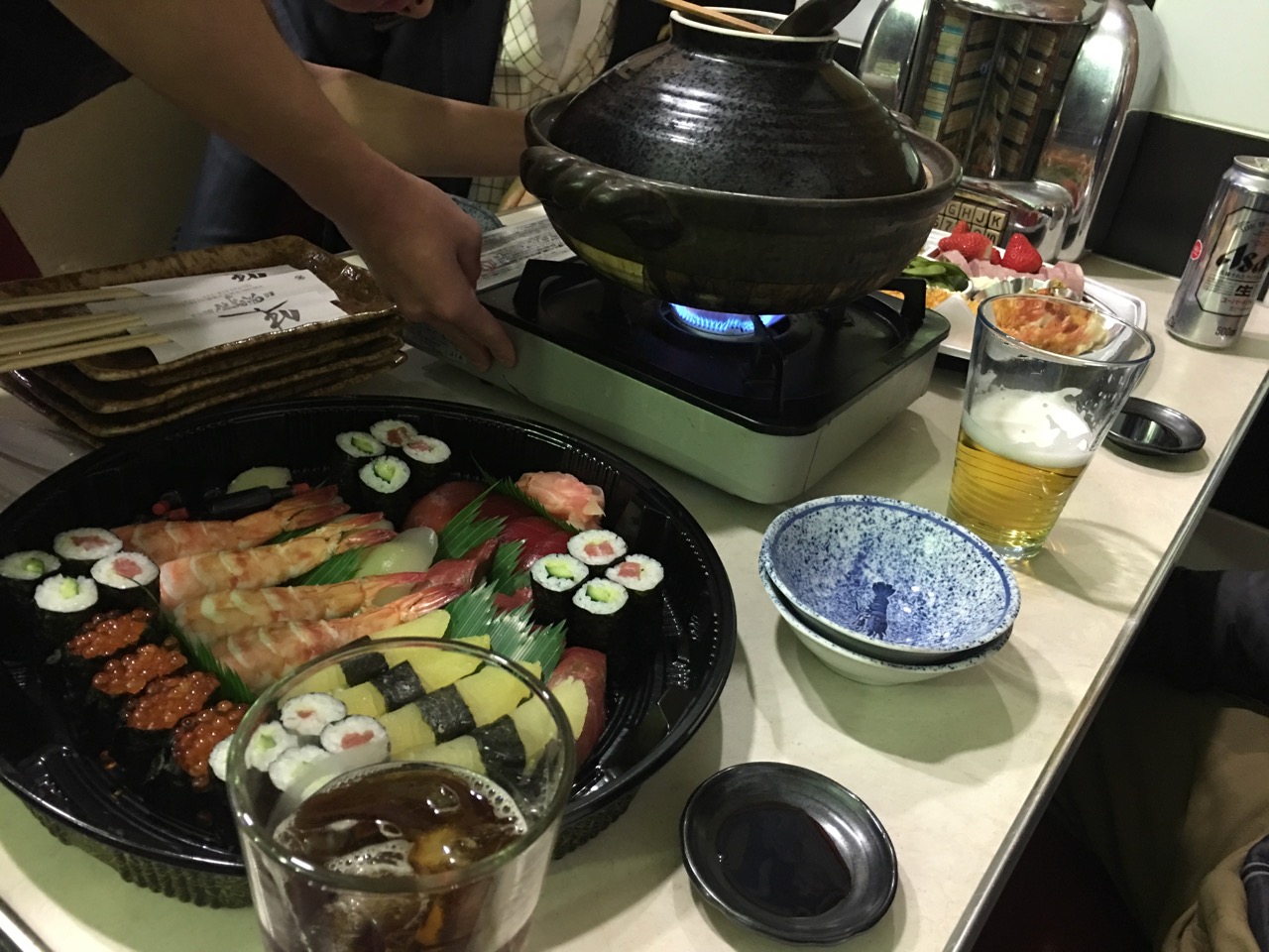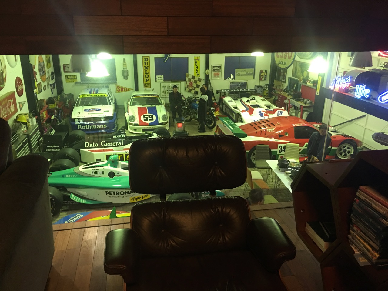 レーシングカーが十数台展示されるガレージには友人たちが集えるようにレストランのようなソファとテーブルが並び、この日は新年会らしくレーシングマシンたちを眺めながら鍋と寿司をつつきました。