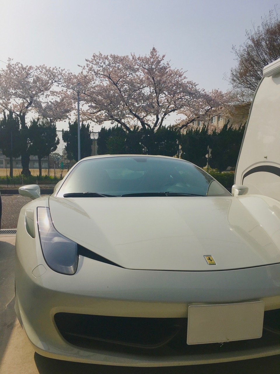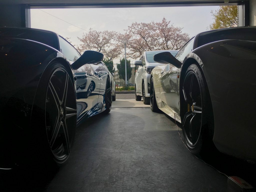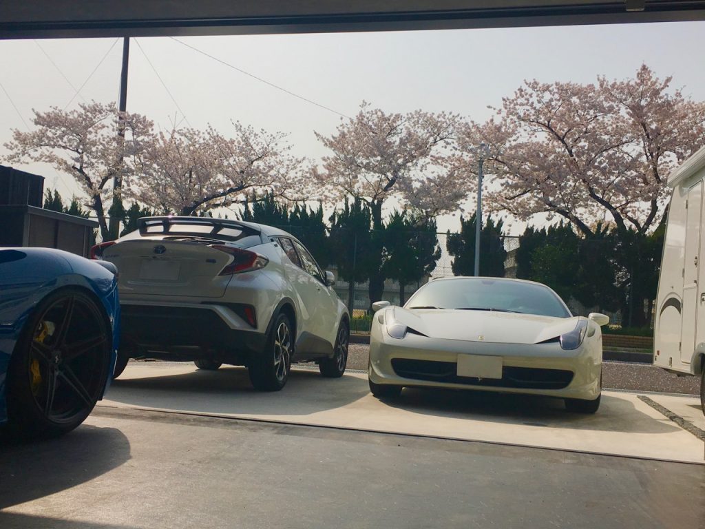 当社で去年に企画し建築した賃貸ガレージハウス(Ys Garage North)のご入居者様のガレージへお邪魔してきましたら、ちょうどまだ桜が咲いている時期だったのでガレージからクルマ越しの花見ができました。